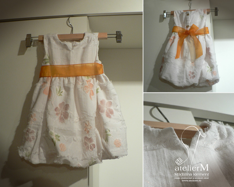 Rochita este realizata dinbumbac cu flori pastel, se inchide in nasturei pe spate si are un cordonas asortat in doua variante (din panglica de organza sau din bumbac).